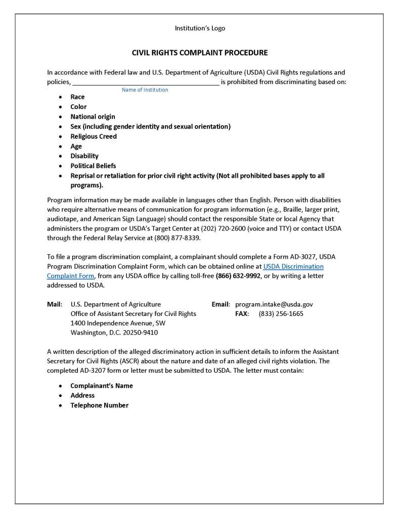 To file a program complaint of discrimination, complete the USDA Program Discrimination Complaint Form (AD-3027) found online at: How to File a Complaint, at any USDA office, or write a letter addressed to USDA and provide in the letter all of the information requested on the form.